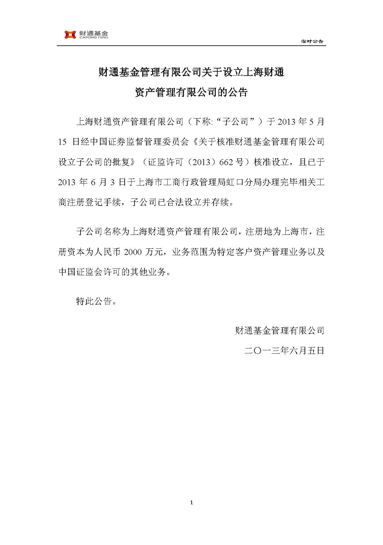 (財(cái)通基金管理有限公司關(guān)于設(shè)立上海財(cái)通資產(chǎn)管理有限公司的公告下載)